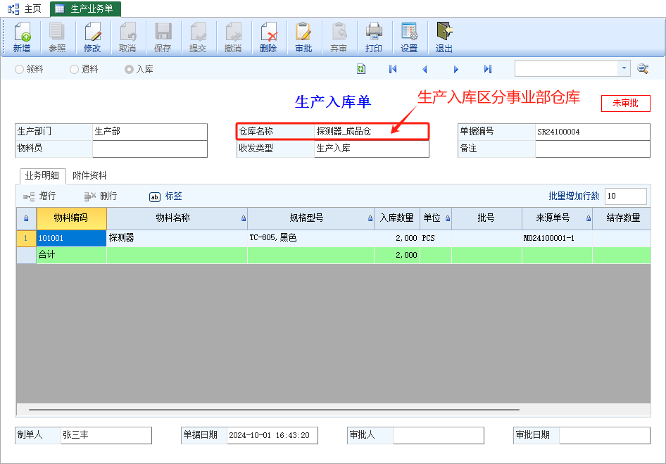 - 生产完工入库时,选择自己事业部的仓库办理入库,如下图所示: