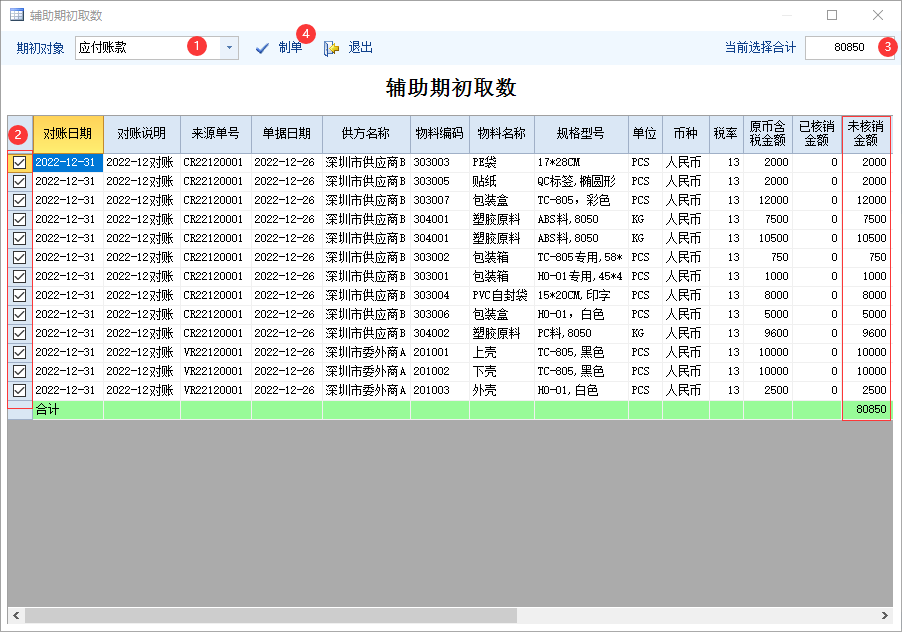 - 第1步:选择期初对象后,过滤以启用期间前结存的期初余额明细