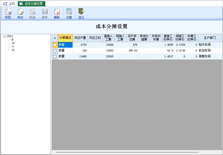 - 第1步:选中期间,点【修改】维护相关数据,并通过【取数】,汇总当月总产量与总工时,维护完成后,自动计算直接工时单价与间接工时单价,然后点【保存】即可。