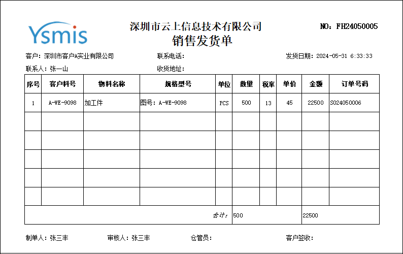 加工件入库后,业务凭销售订单生成发货单,并打印出送货单如下图;